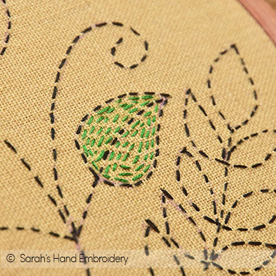 | Fig 3: The pattern already looks pretty. | Fig 4: Now, fill each element in the pattern with concentric rows of the Running Stitch. I have used green color for the big leaves. |