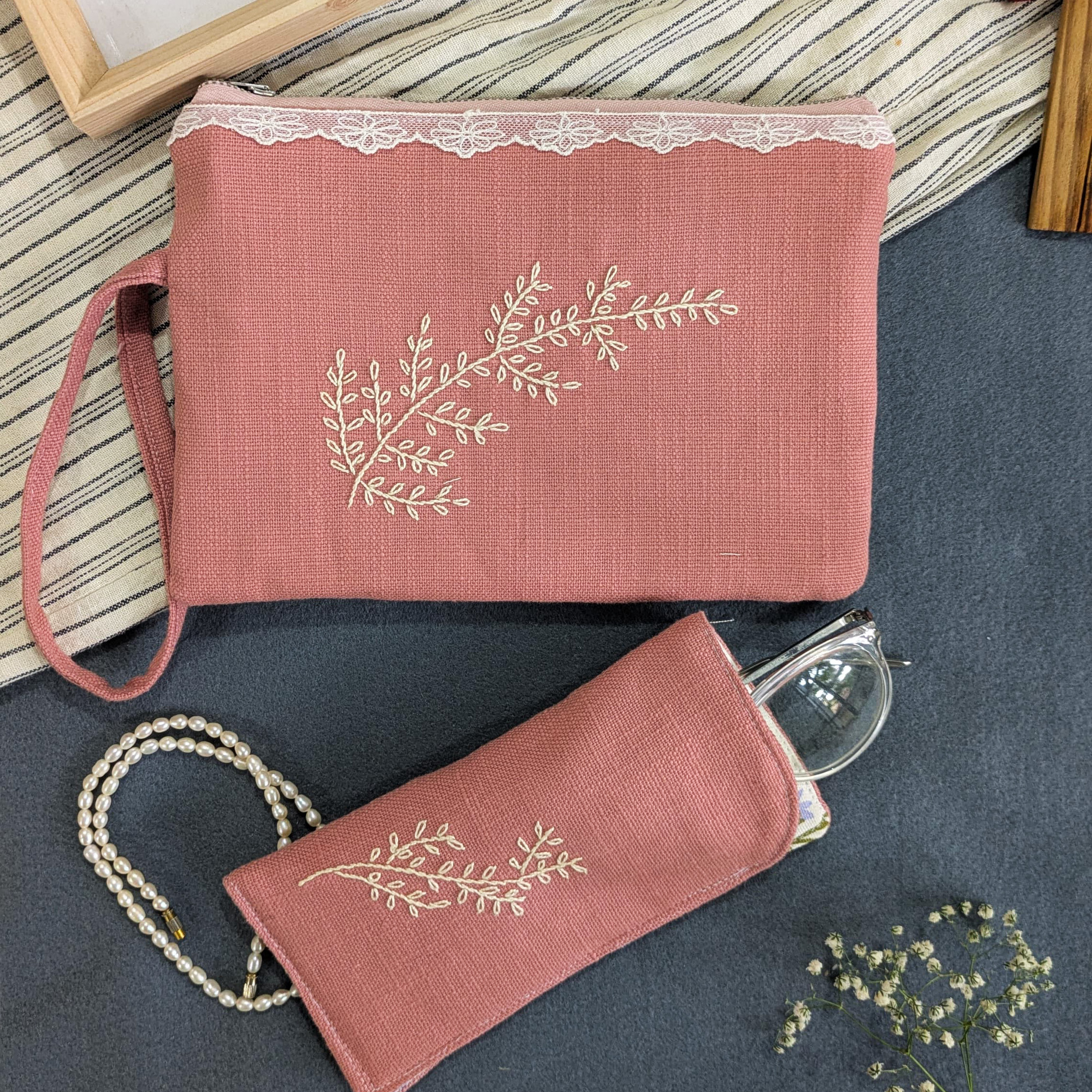 A vanity pouch and an eyeglass cover adorned with simple hand embroidery