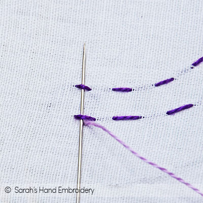 Fig 3: Now bring out another thread from one end of the bottom row and pass under the first stitches. Fig 4: Take a turn and pass under the second stitches. Continue with this process.