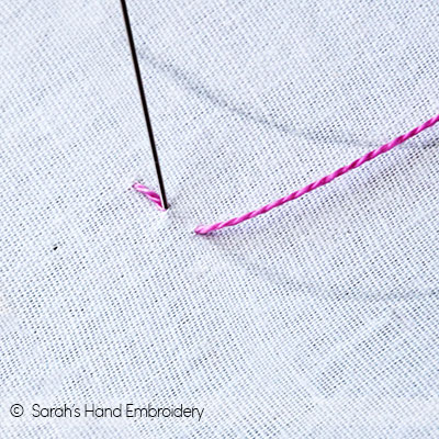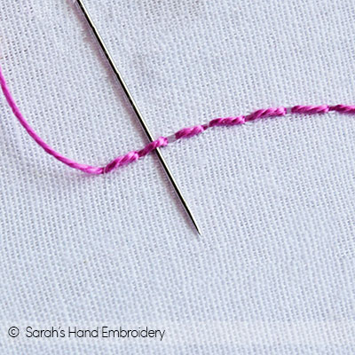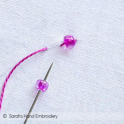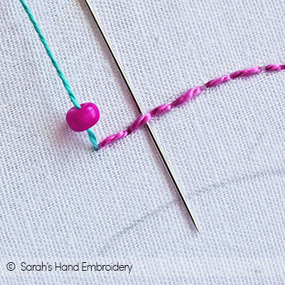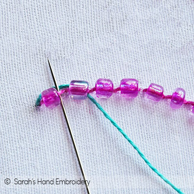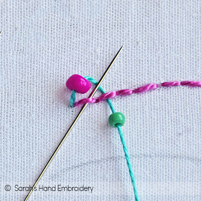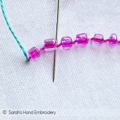 Fig 5: Push the bead down and pass the needle under the Back Stitch, as shown. Fig 6: Again, slip in a bead.