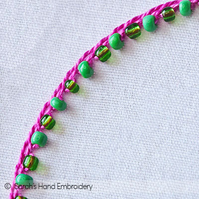 The Pekinese Stitch is wonderful to play around with beads. The weaving of the thread over a base stitch gives us enough room to experiment with different kinds of beads and looks. Try out different variations with different sized and colored beads. Each time, it will fascinate you!