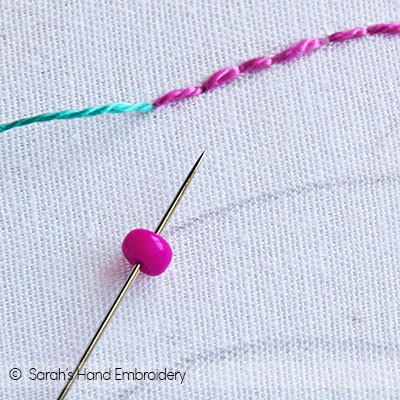 Fig 3: Push the bead to the base and pass the needle under the Back Stitch, as shown. Fig 4: Next, slip in another bead. I have used a smaller one.