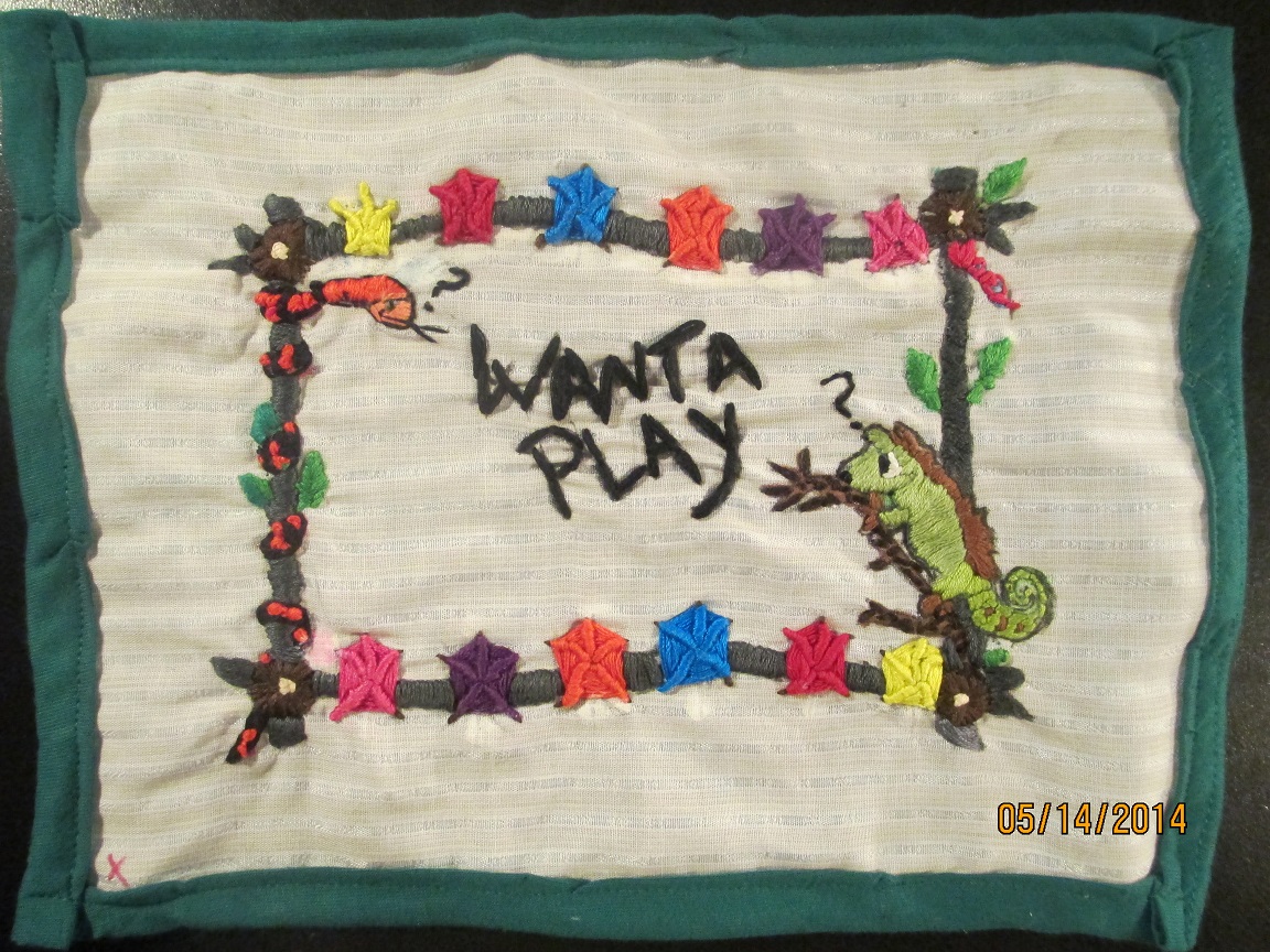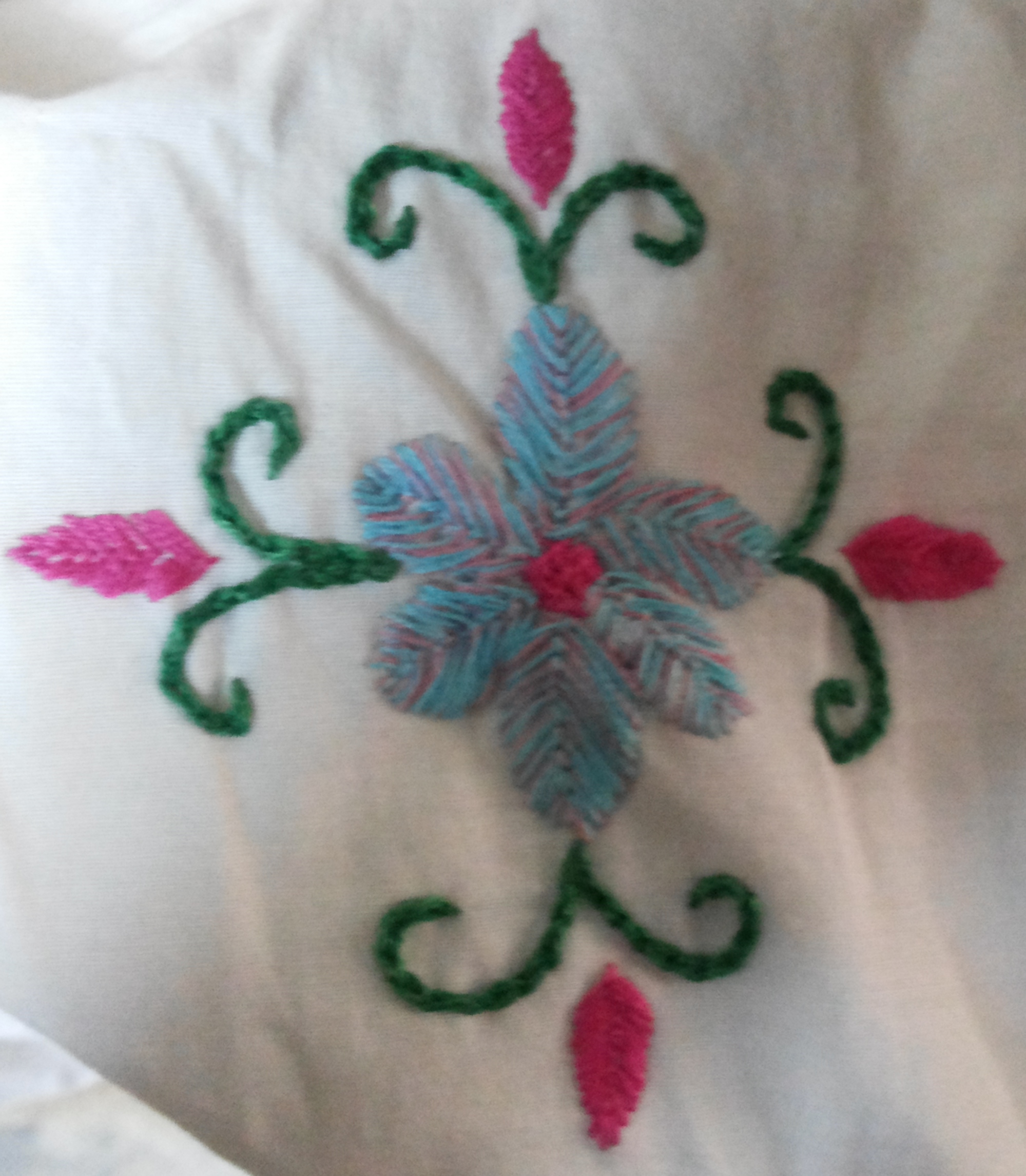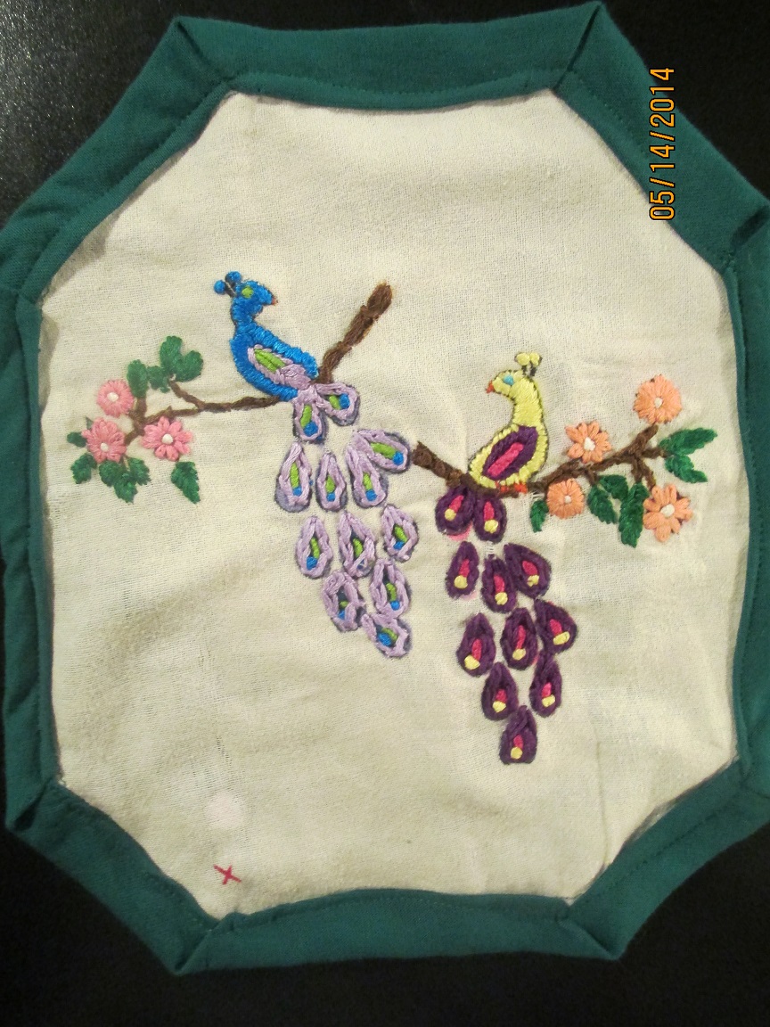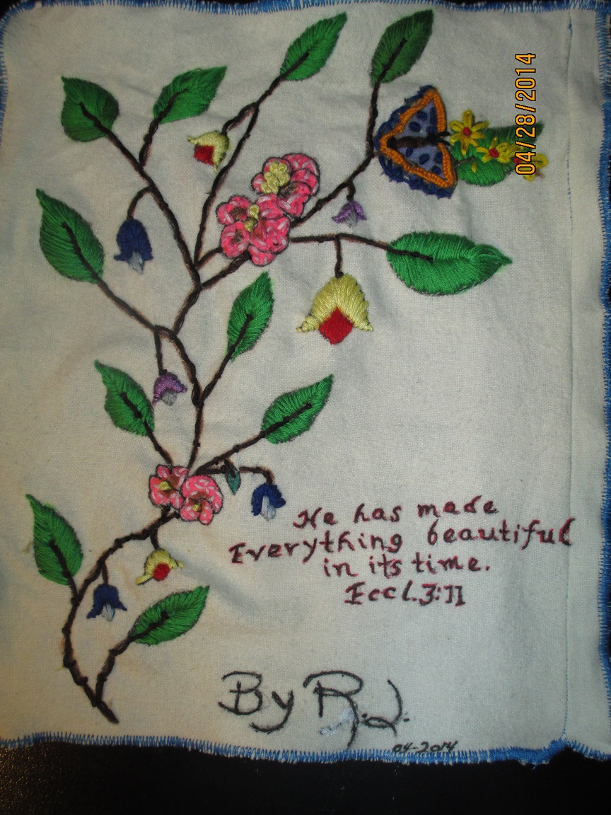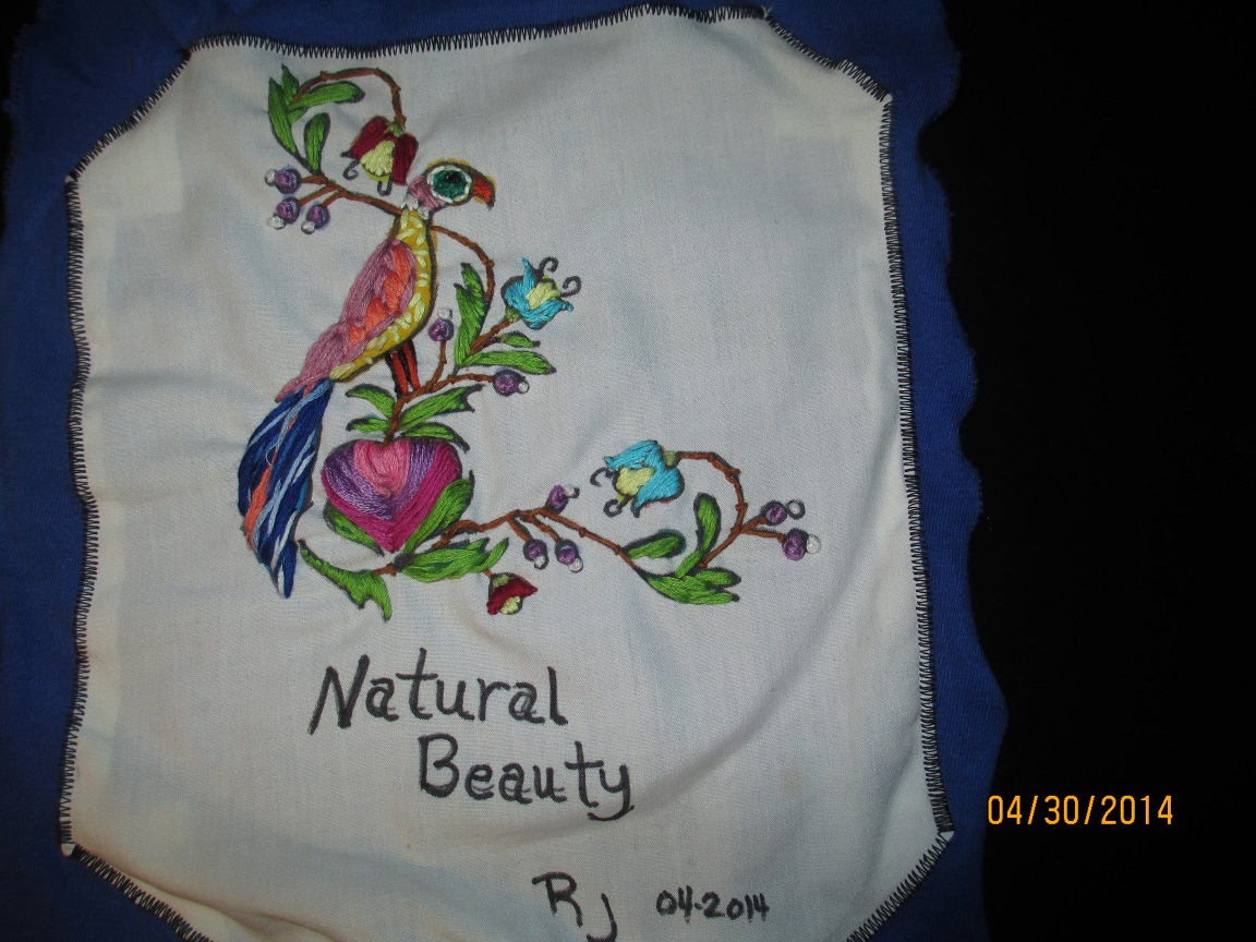 This was my VERY FIRST try at embroidery, and, it’s not very good, but I am still working at it and getting better. The stitches are random. I am very open to suggestions on how to do this particular type thing better.