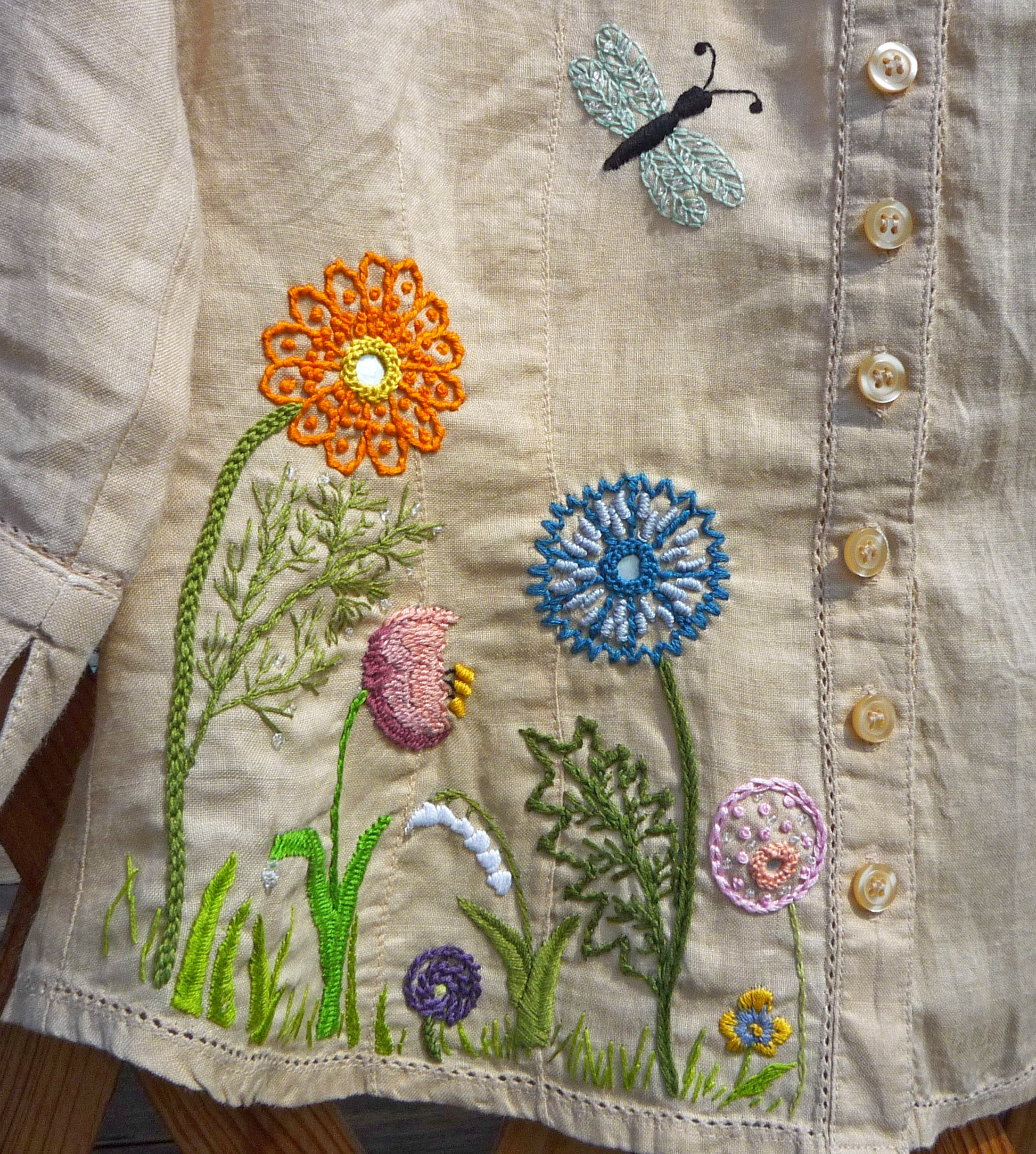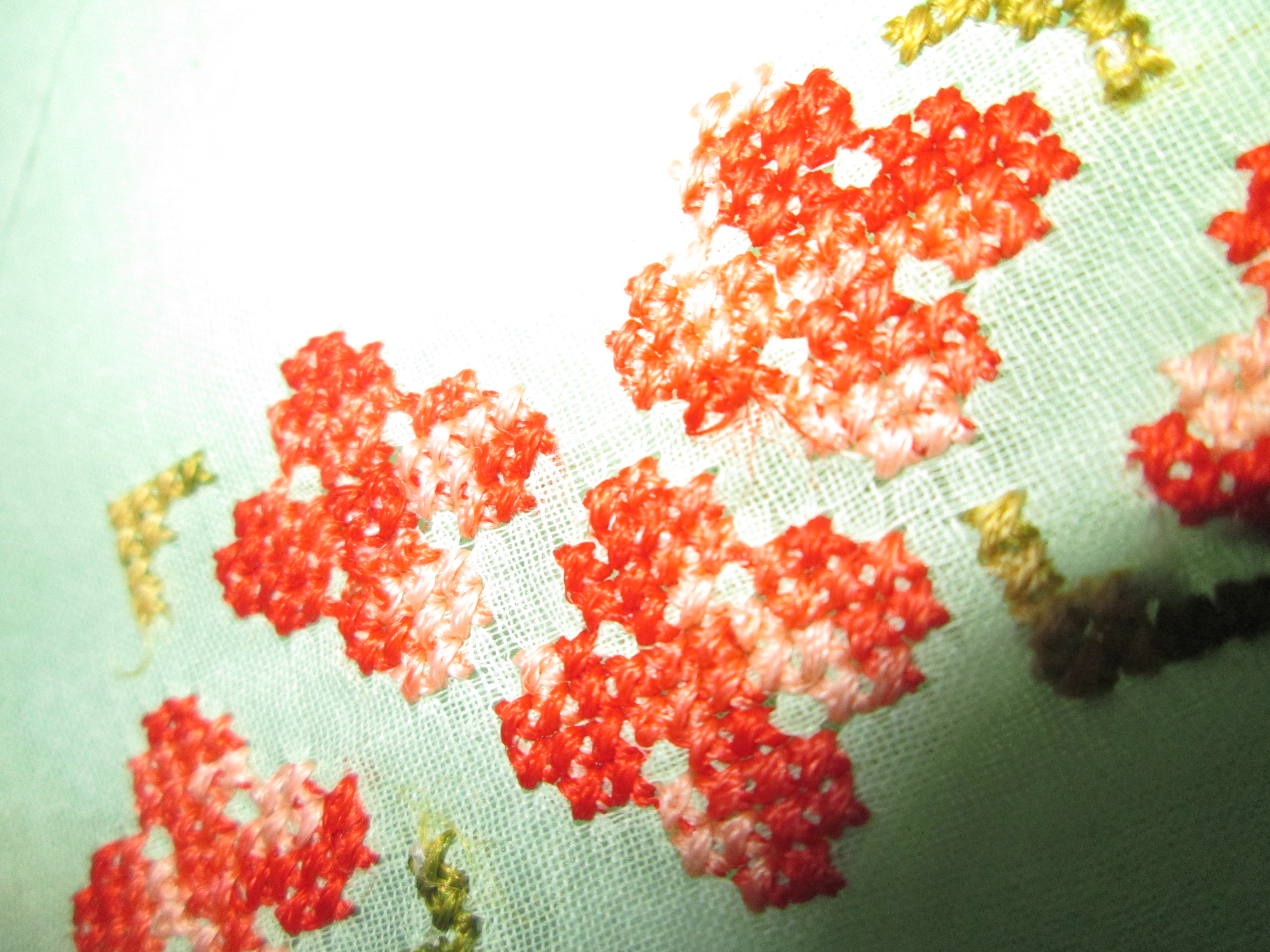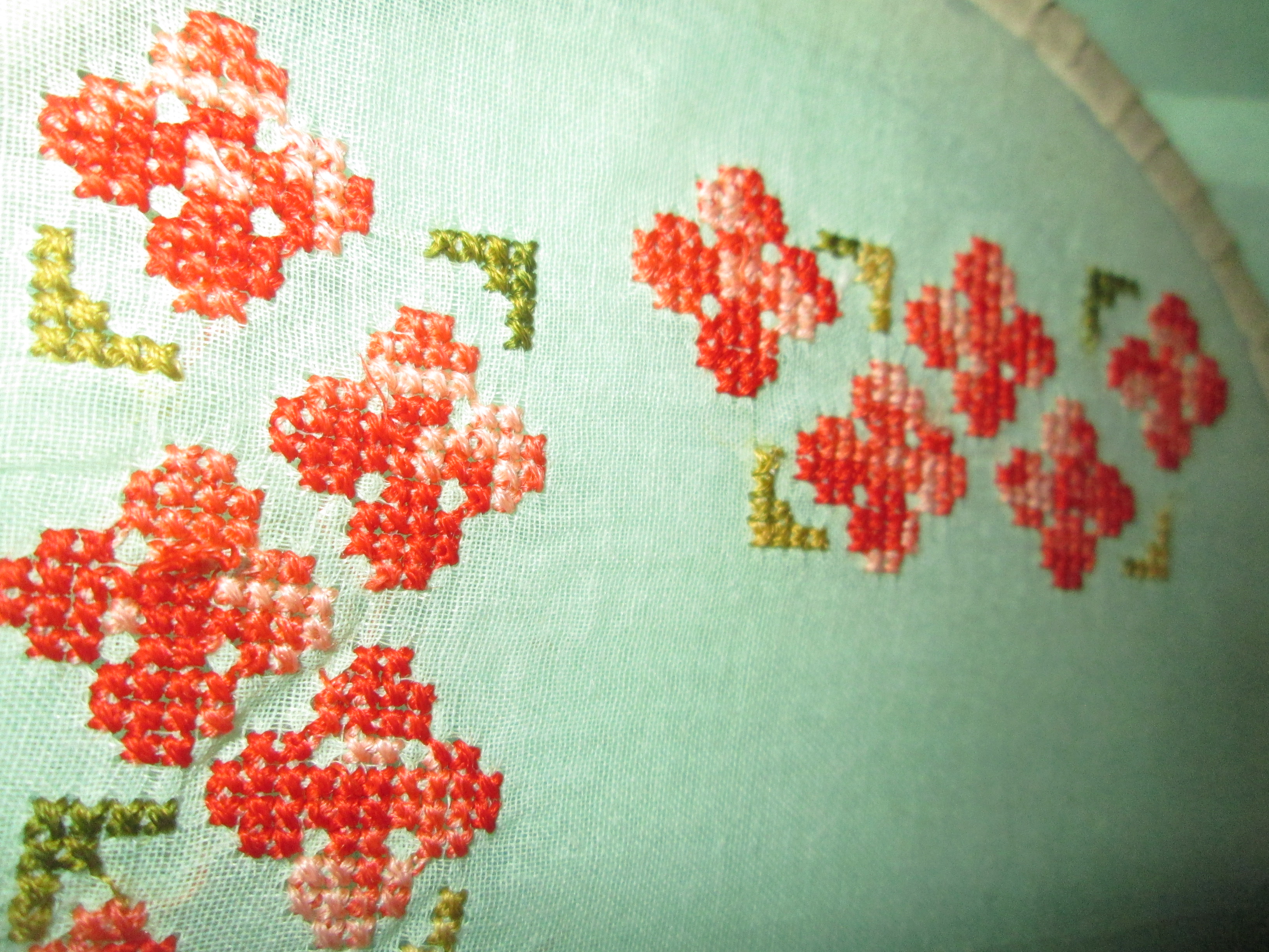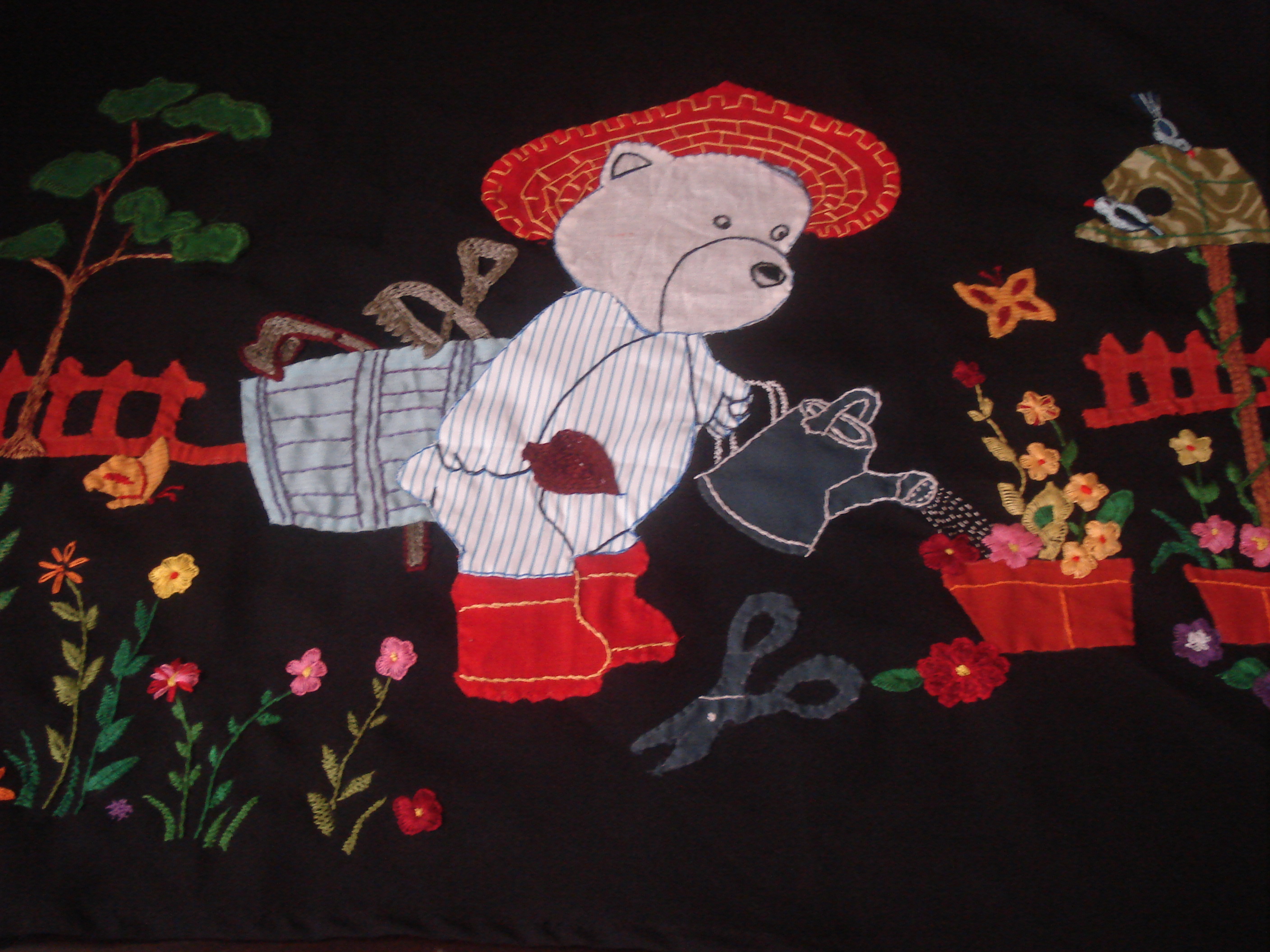 This was my VERY FIRST try at embroidery, and, it’s not very good, but I am still working at it and getting better. The stitches are random. I am very open to suggestions on how to do this particular type thing better.
