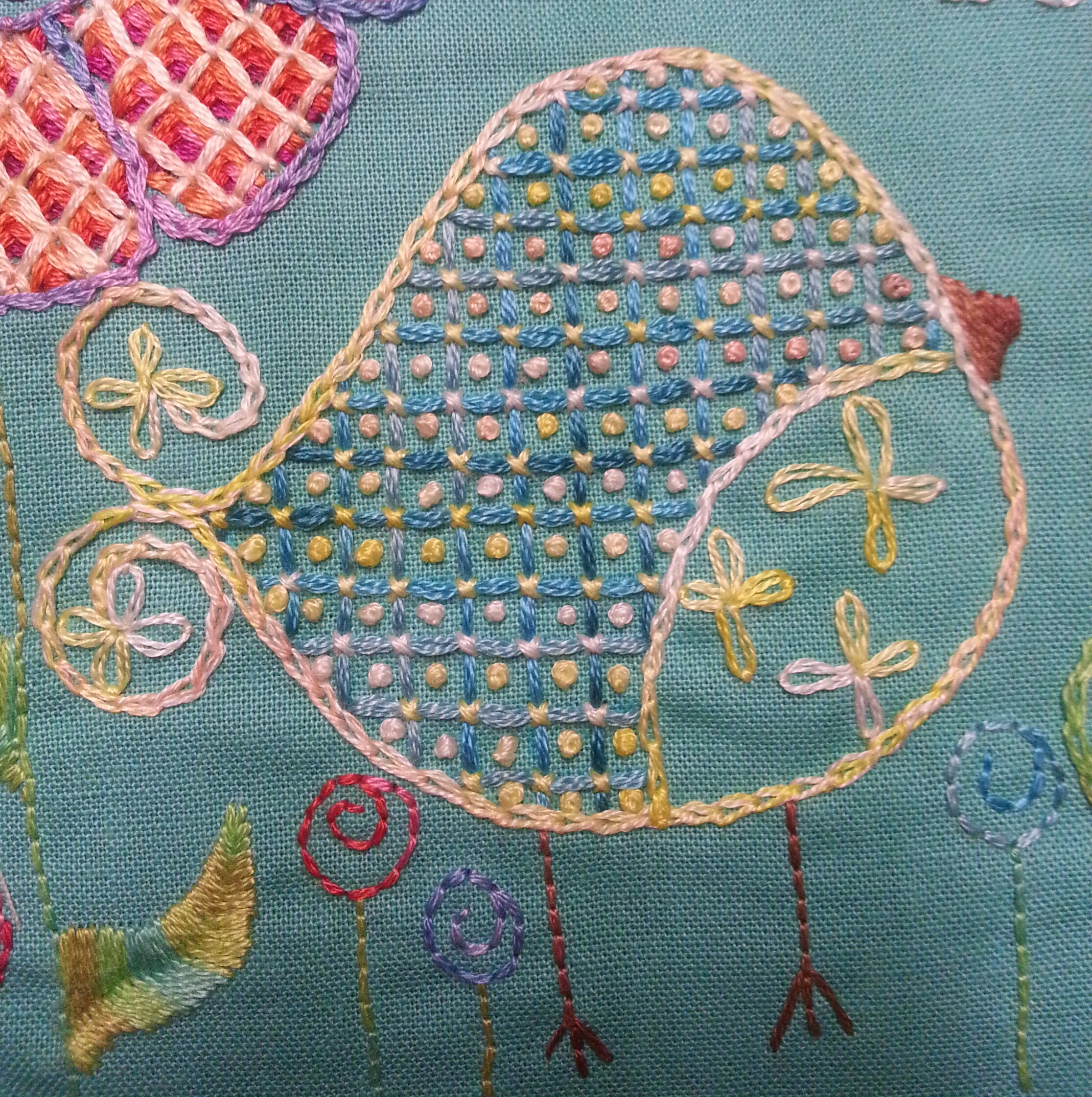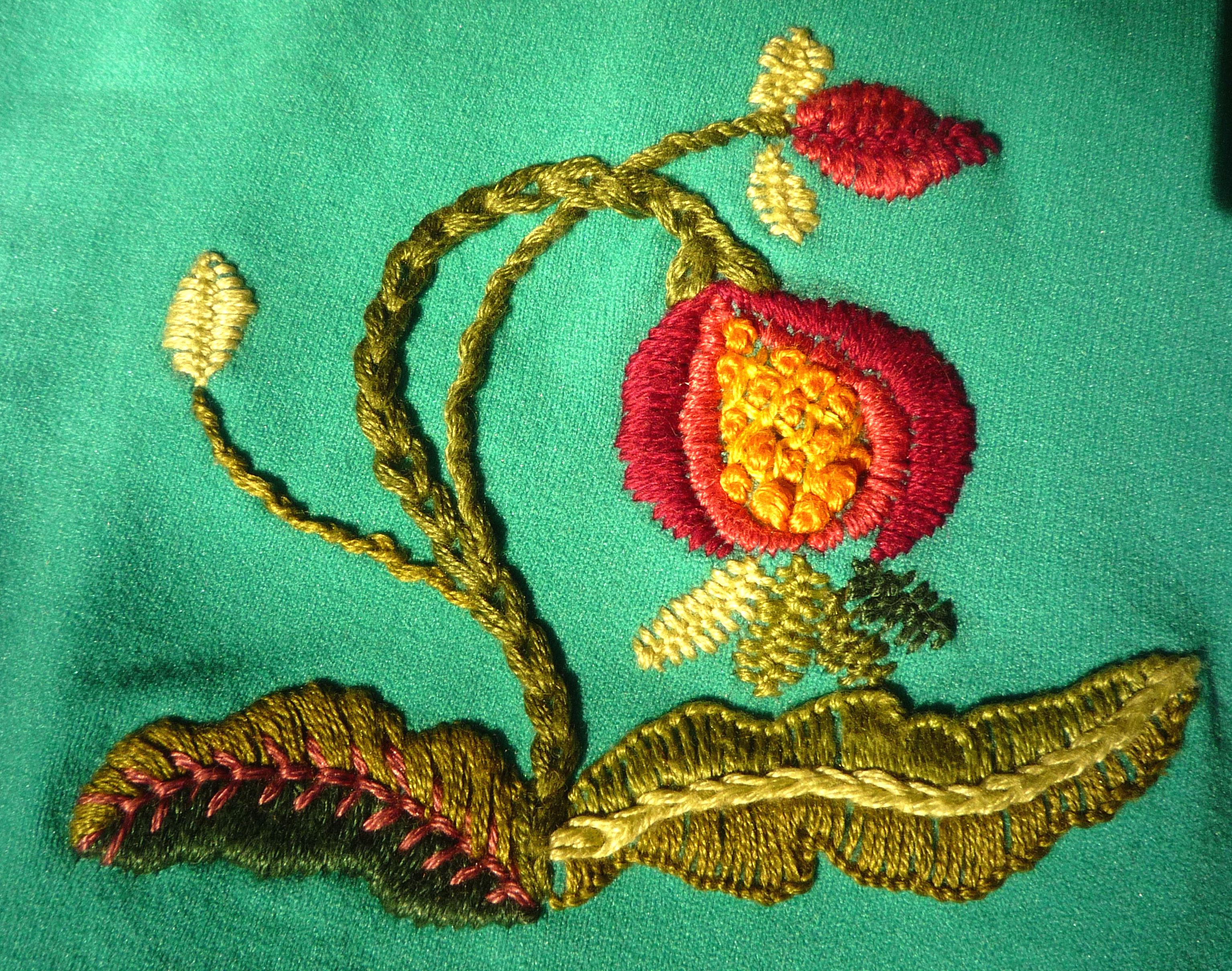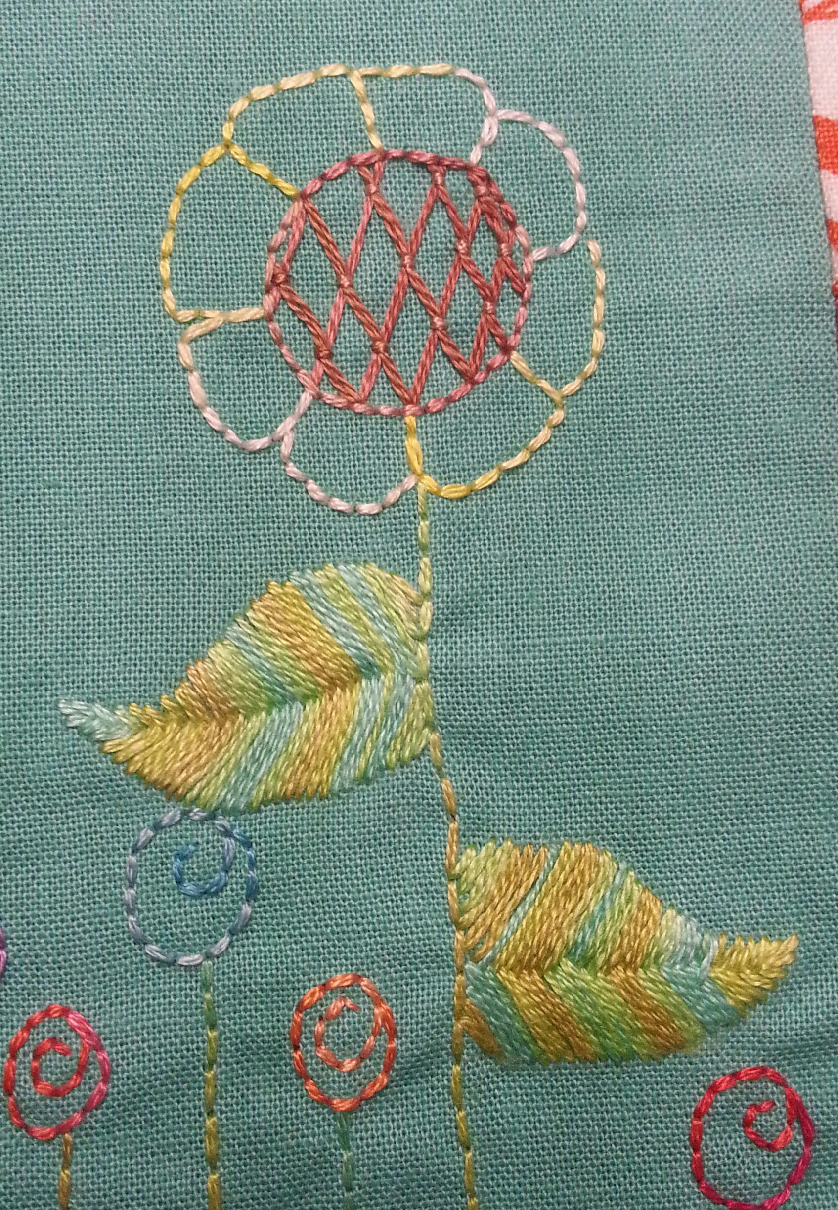 fishbone, coral, chain, backstitch, rice, stem lazy daisy, satin, butterfly chain, whipped backstitch, buttonhole wheel, seed.