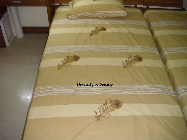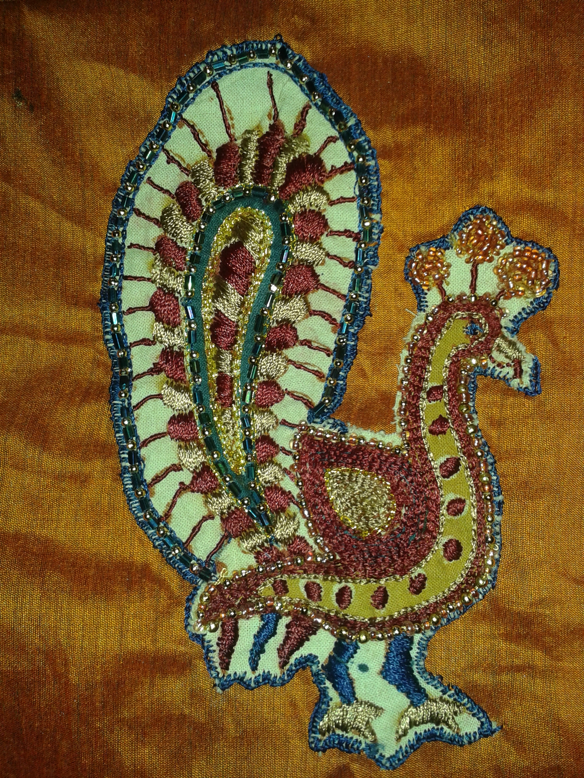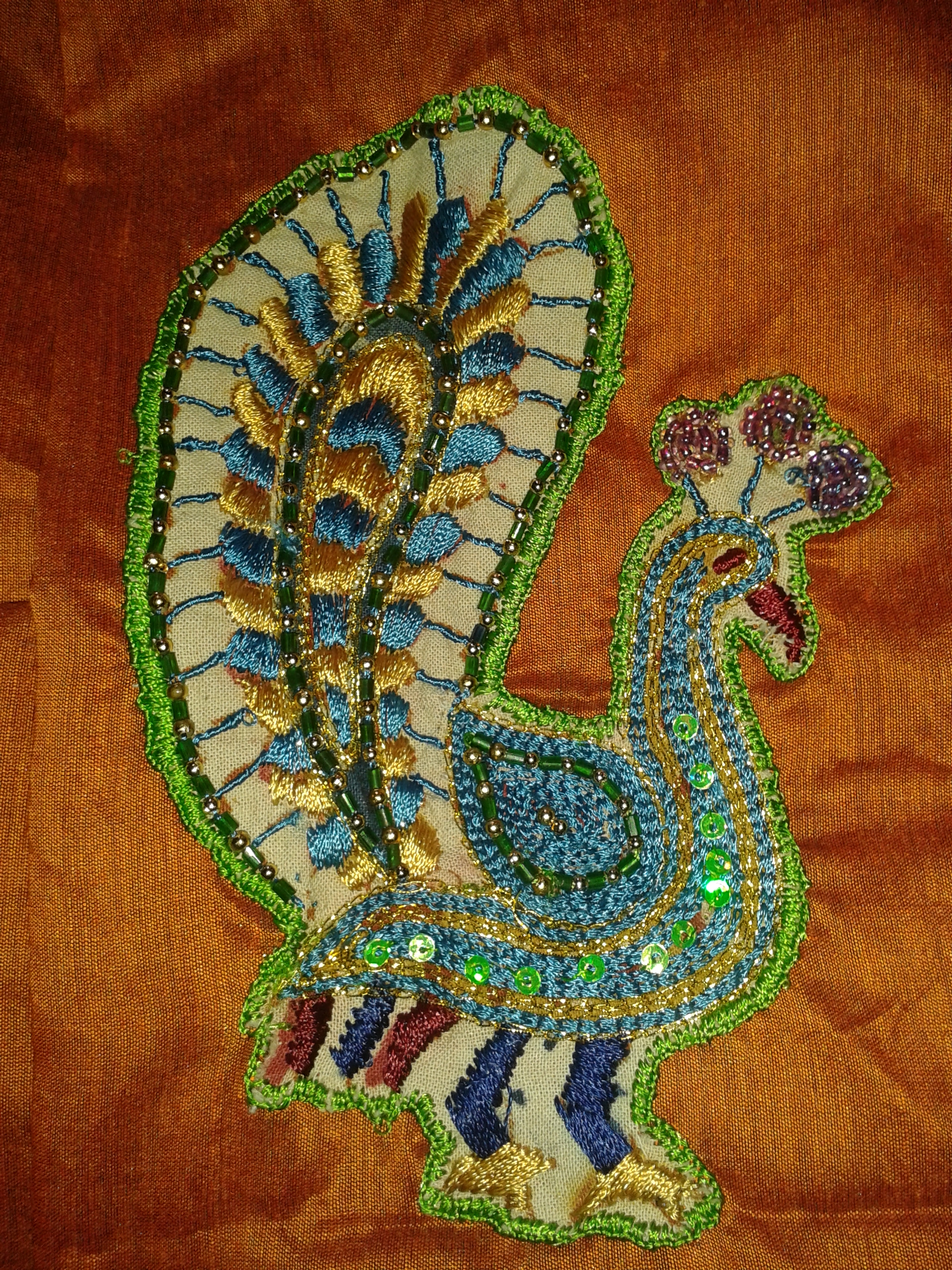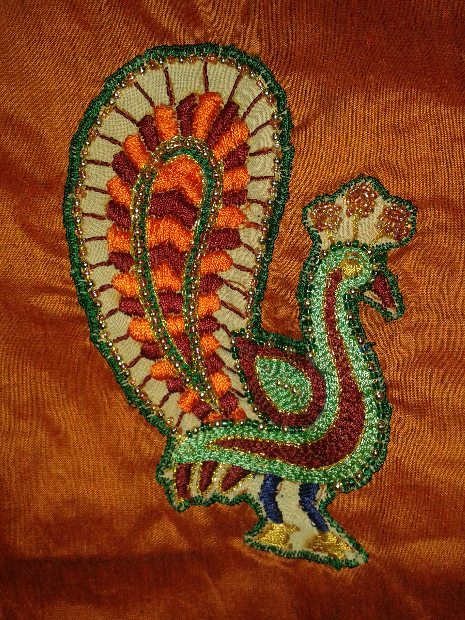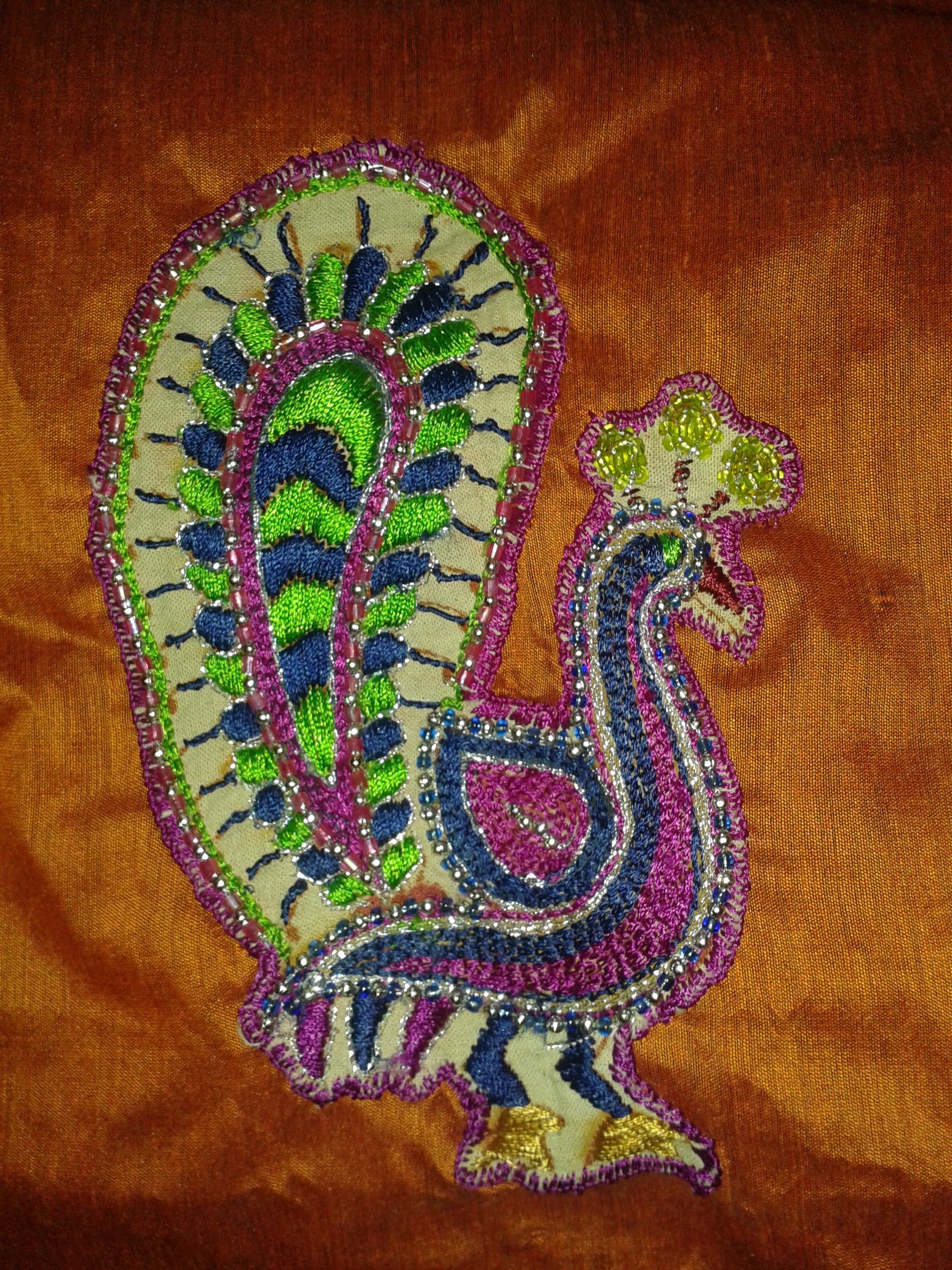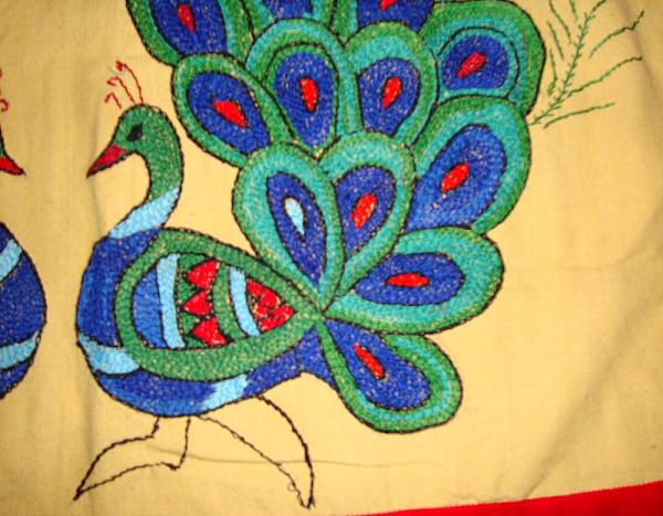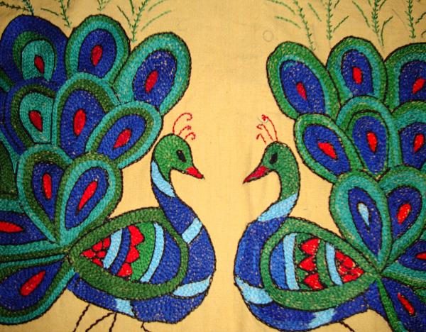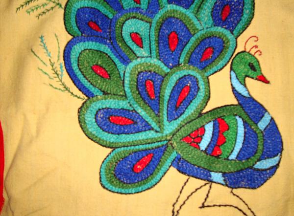 The peacock feather edges were worked with closed buttonhole and satin covered the interior part of the feathers . Filled in the body of the peacock with chain stitch . Just I used some multi -colours to charm the peacock .