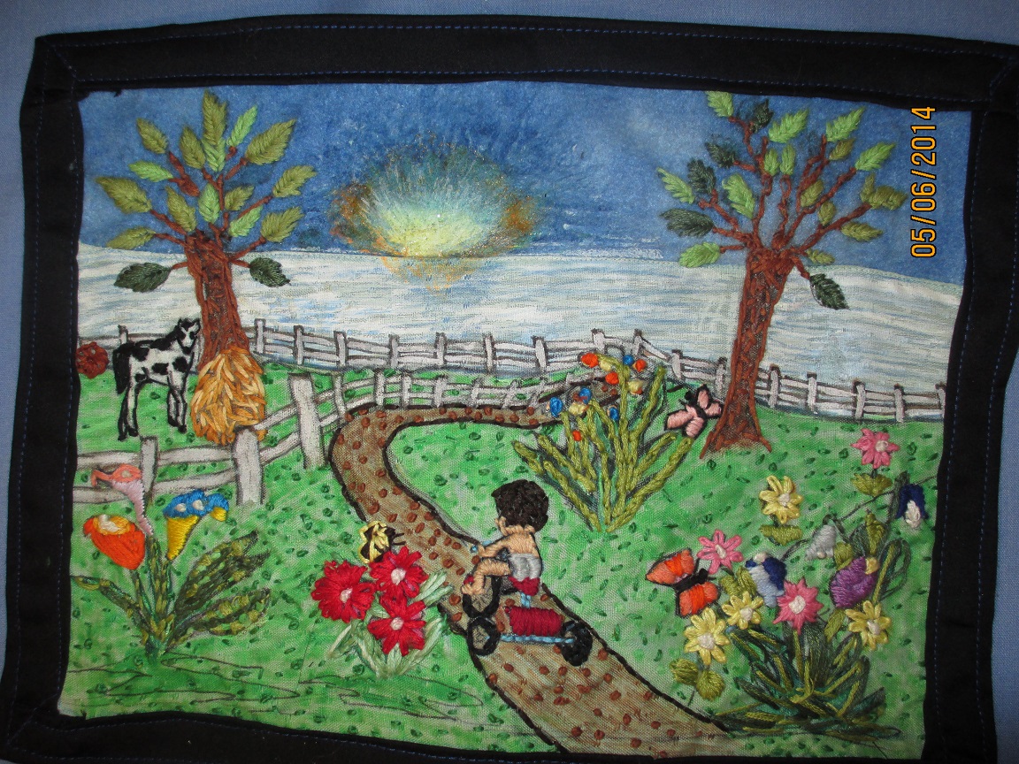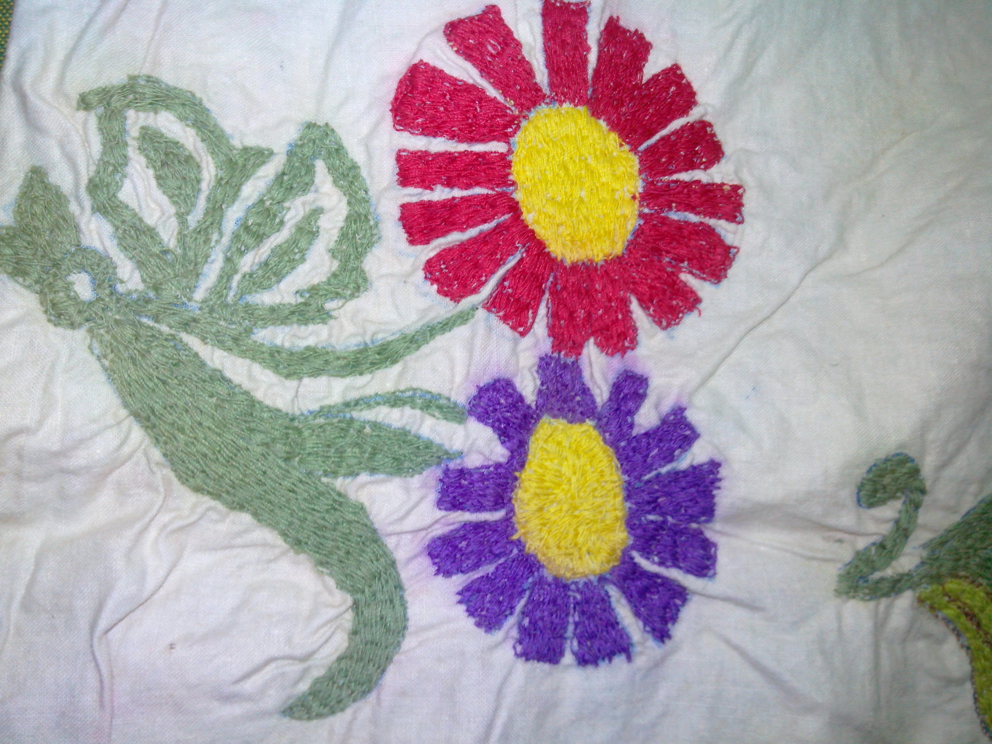 Yellow, blue and purple flowers are lazy daisy and satin.