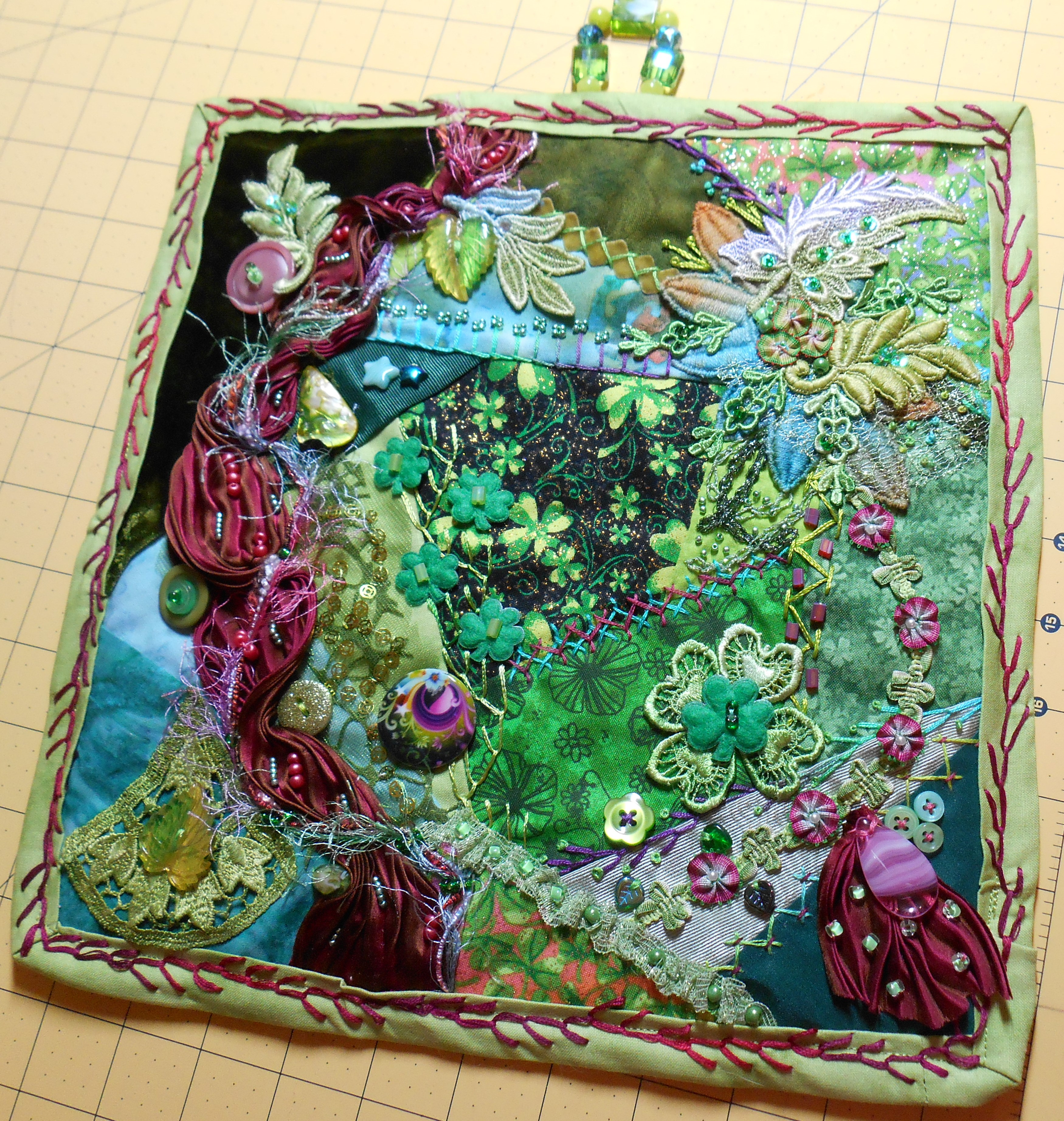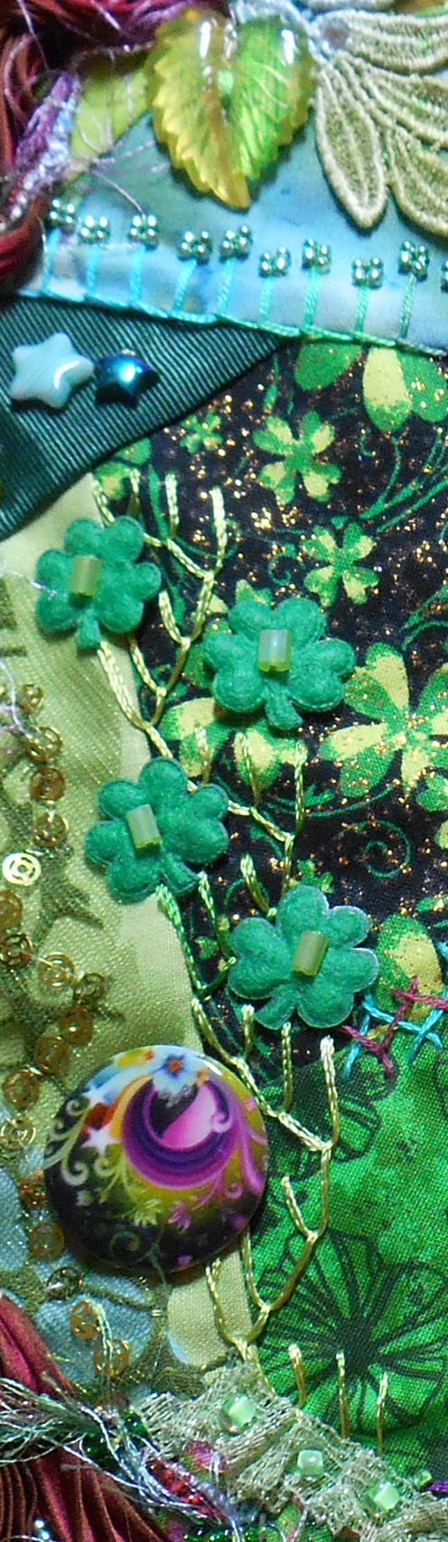 I made this St. Patrick’s Door Hanger, March 2014; the stitch below is the featherstitch done in Rayon threads with felt buttons. right above it is a button hole stitch with beads.