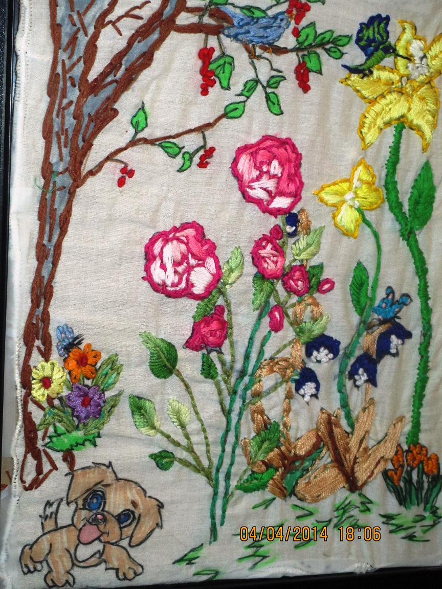 I call this “My Garden”. I used chain, french knot, straight, back, lazy daisy, padded satin – that I remember. I have misplaced my list.