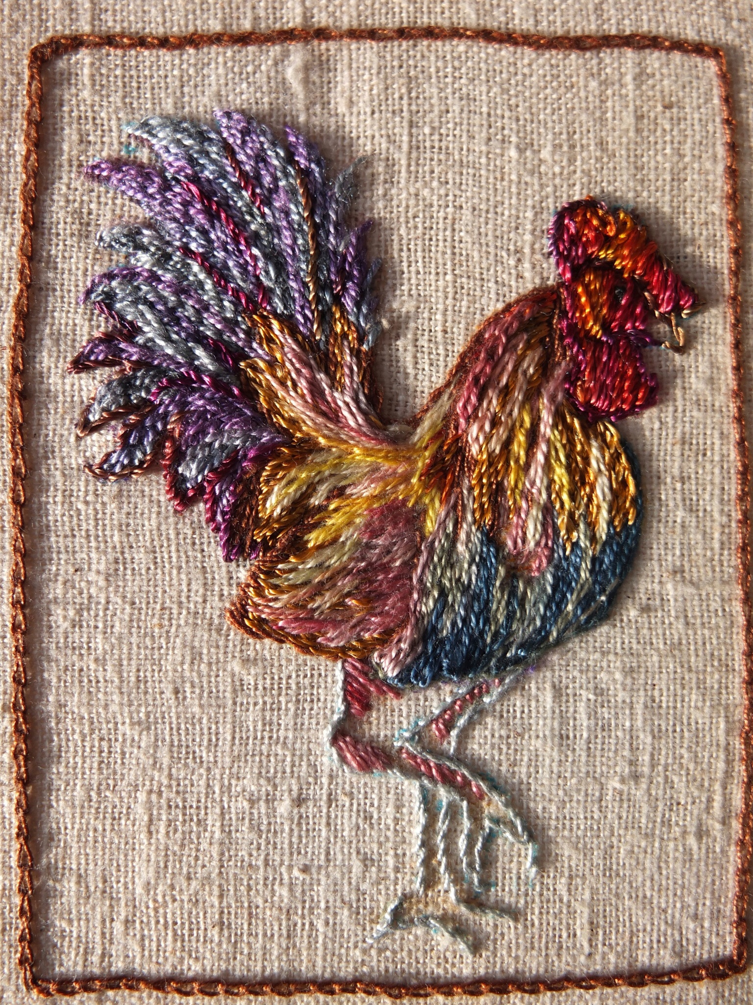 Hello Sarah, hope I’m not too late to contribute…. This piece I have titled “Wakey, Wakey” It has been stitched in space dyed rayon threads using only chain and straight stitches.