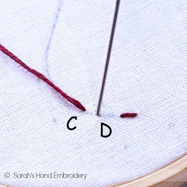 | Fig 1: Start by making a single Straight Stitch. | Fig 2: Next, come out from C. This time, instead of going all the way back into the earlier stitch point to make a Back Stitch, you would go only half the way through at D. This makes a small stitch and a gap! |