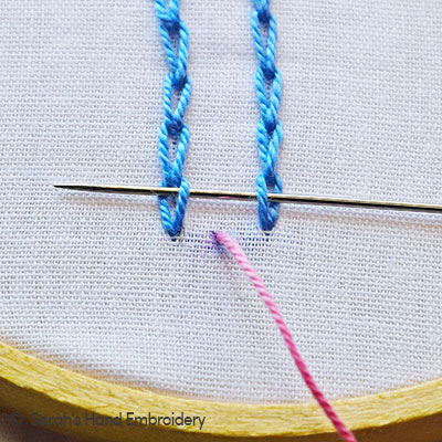 | Fig 1: Make two parallel and aligned rows of the Chain Stitch. | Fig 2: Now, with another thread, come out from the center gap between these rows. Pass the needle under the inner sides of both the Chain stitches, as shown. |