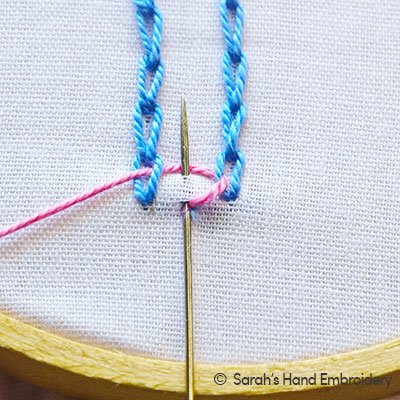 | Fig 3: Then, take the needle through the earlier stitch point and come out in alignment to the Chain Stitches in the two parallel rows, as shown. | Fig 4: Pull out the needle completely and you will see that a Chain is formed linking the two parallel rows. |