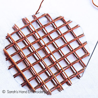 | Fig 5: I make the third layer of vertical stitches using a much lighter shade. | Fig 6: My pattern reminds me of a waffle after finishing the third layer of the horizontal stitches |