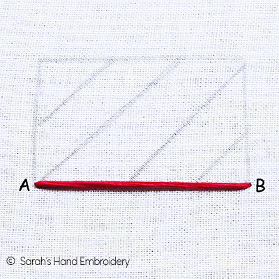 | Fig 1: Divide the pattern into diagonal sections. The Couching Stitch will fall on these lines. So, next time, you can try with a different pattern! | Fig 2: Lay a stitch A-B from one end of the pattern to the other. |