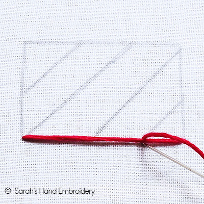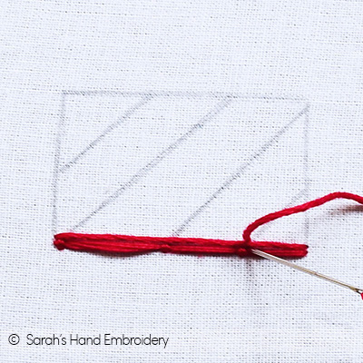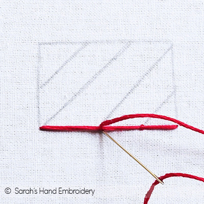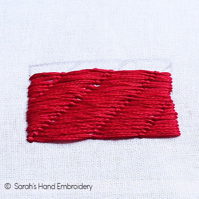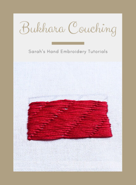 Bukhara Couching is used in embroidery forms from Bukhara, the fifth largest city in Uzbekistan and once a main center of the Persian Civilization. Since it is located on the Silk Route, it is easy to understand that this stitch must have traveled much further than its place of origin. Bukhara Couching is like Convent Stitch but follows a pattern. The illustration shows patterns in diagonal lines, which is the most common one. You can get creative and try to draw any other design like concentric squares, circles, or anything like even a leaf or flower!