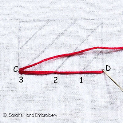 | Fig 5: When you finish the first row, continue with the same needle and thread to lay another stitch C-D, closer to the earlier one. | Fig 6: Ensure there is no space between the laid threads. |