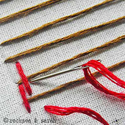 | Fig 3: Next, come out from just above the laid thread and take it over the laid thread of the next row to take it in just below the third row. Keep doing this alternately for a brick formation. | Fig 4: A finished portion of the Burden Stitch will look rich like this. |