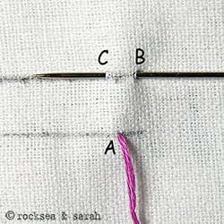 Fig 1: Start by bringing out the needle from point A in the lower stitch line. Then, Take the needle in through B and out through C, both slightly angled from A, as shown. Fig 2: Now, take the needle from under the the stitch A-B, without plucking the fabric beneath, as shown.