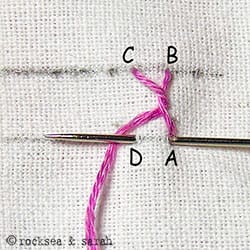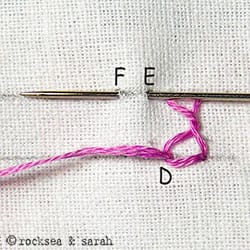 Fig 3: Pull out the needle and see a twisted effect happening. Next, put the needle in through A and out through D, a point directly below C. Loop the thread under the needle and pull out the needle. Fig 4: Begin the next stitch, by taking the needle in through E and out through F. There is a slight gap between C and E.