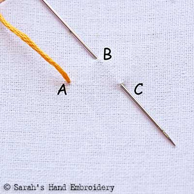 Fig 1: Start by coming out from A. Go in through B and come out again through C. The stitch points fall on the corners of an imaginary triangle. Fig 2: Next, pass the needle under the stitch A-B. Do not pluck the fabric underneath.