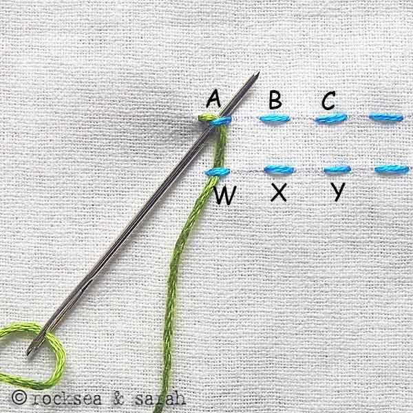 | Fig 2: Take another thread and bring it out from near A. Take the needle under the stitches A and W, as shown. Turn around the needle and take it from under A again. Continue this action by taking the needle under B and X, C and Y, and so forth. Make sure not to pluck the fabric while doing this. |