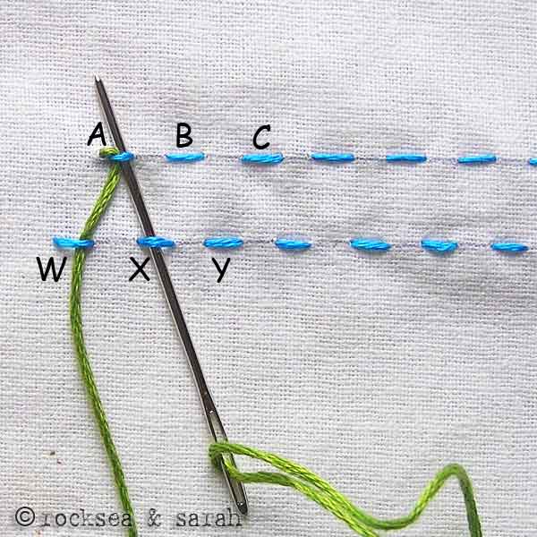 | Fig 2: Take another thread and needle out from near A and pass it under A and W without plucking the fabric underneath. Turn the needle around and pass the thread under X and A. | Fig 3: Now, pass the needle under B and X without plucking the fabric underneath. Continue this pattern of action for the remaining stretch of the stepped running stitch. | |