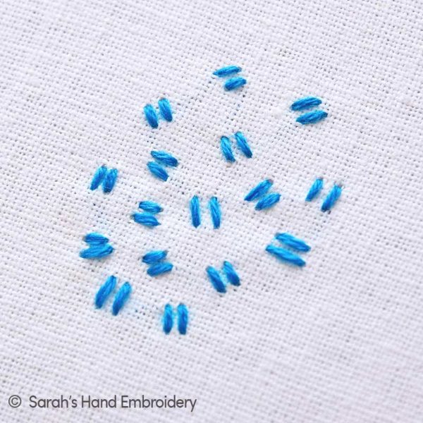 The Speckling Stitch is similar to Seeding or the Rice Stitch, except that instead of using a single straight stitch each time, two parallel straight stitches are placed close to each other. Sometimes, these parallel stitches share the same stitch points to make a single but bolder stitch. Add one more stitch to it, and it just becomes the Granitos! There are so many variants of Seeding that, many times the names slightly overlap each other. If you know this stitch by another name or another stitch with the same name, don’t worry- they are all variants with slight changes.