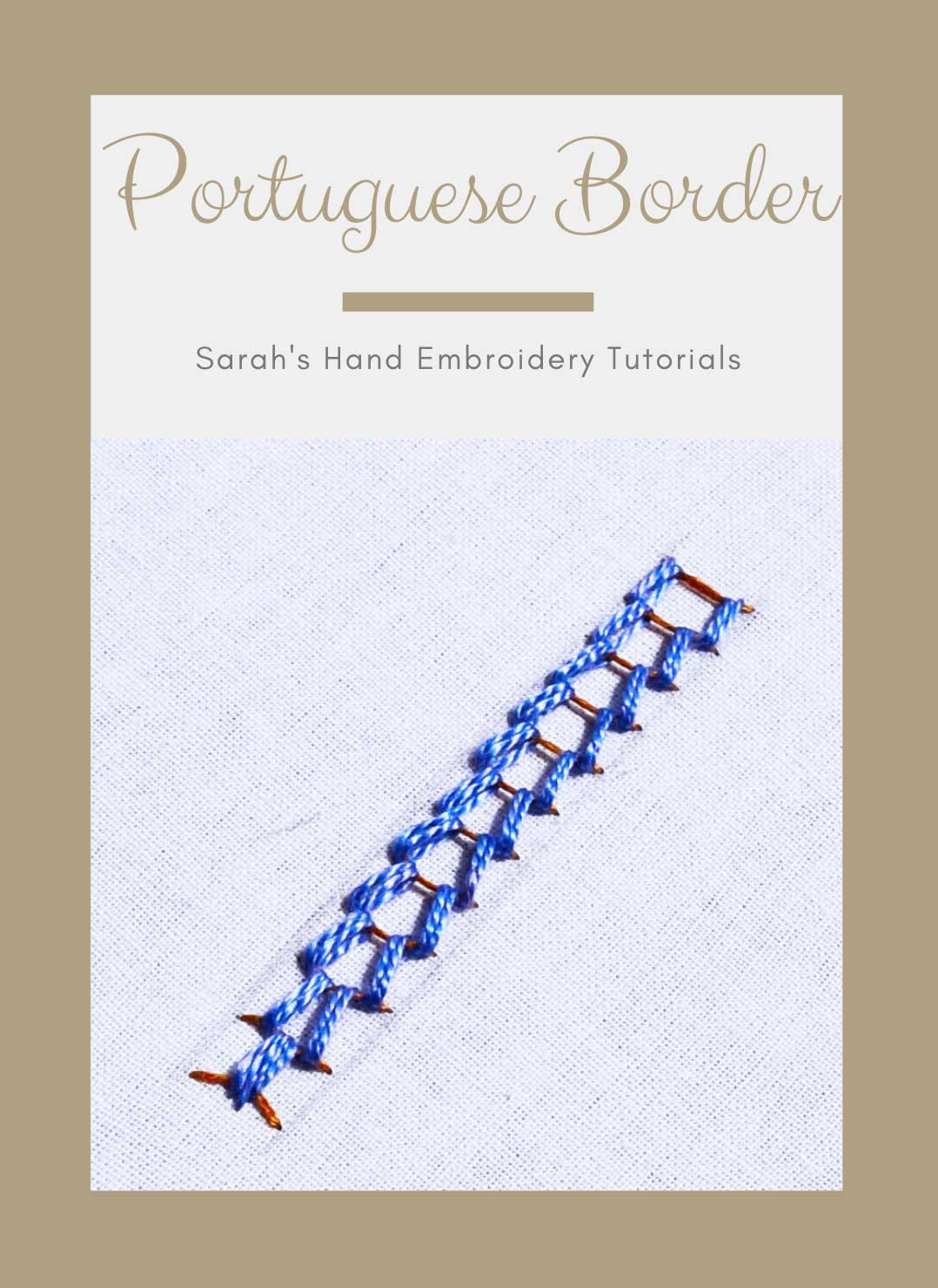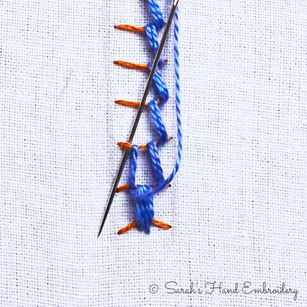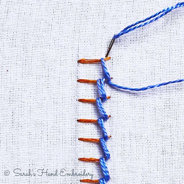 | Fig 9: So, all the stitches will be inclined towards the left this time. When you reach the top, finish up by taking the needle through the fabric and knotting it. | Fig 10: A finished row of the Portuguese Border Stitch will look like this. |