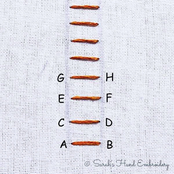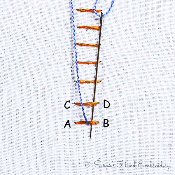 | Fig 1: Start by laying many short Straight Stitches, as shown. I will be working the weave from bottom to top. | Fig 2: So, bring the needle out from just below the first Straight Stitch form the bottom. Pass it under the two straight Stitches A-B and C-D from the top, as shown. |