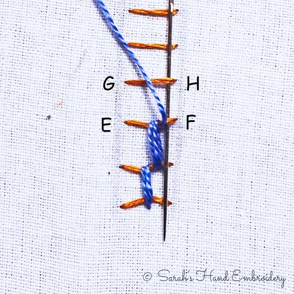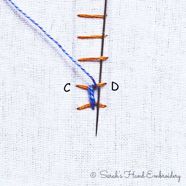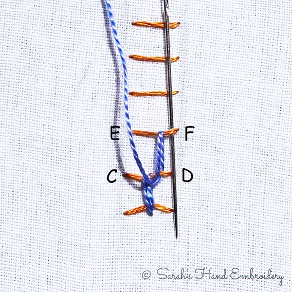 | Fig 3: Next, pass it under just one Straight Stitch C-D. Do not pluck the fabric underneath. Use a tapestry needle to weave, if it helps. | Fig 4: Now, pass it again, under two Straight Stitches C-D and E-F. Then, pass it under just the one stitch E-F. |