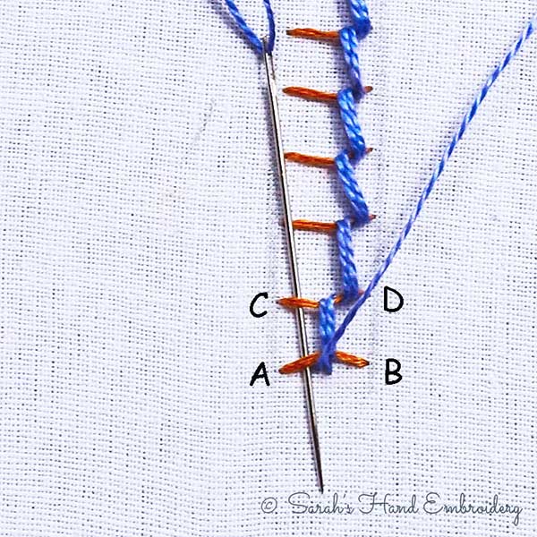 | Fig 7: Start again from the bottom near the stitch A-B. Follow the same process of passing under two stitches, then one stitch while moving upwards. | Fig 8: Only this time, you will keep it to the left of the Straight Stitches. |