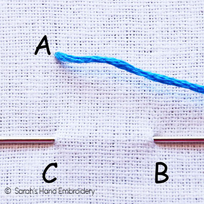 | Fig 3: Do the first step with another thread to overlap the earlier stitch A-B. | Fig 4: Now, go across to take your needle in through D, but on the way, pass your needle under and over the two stitches as shown. This weaves the stitches in place. |